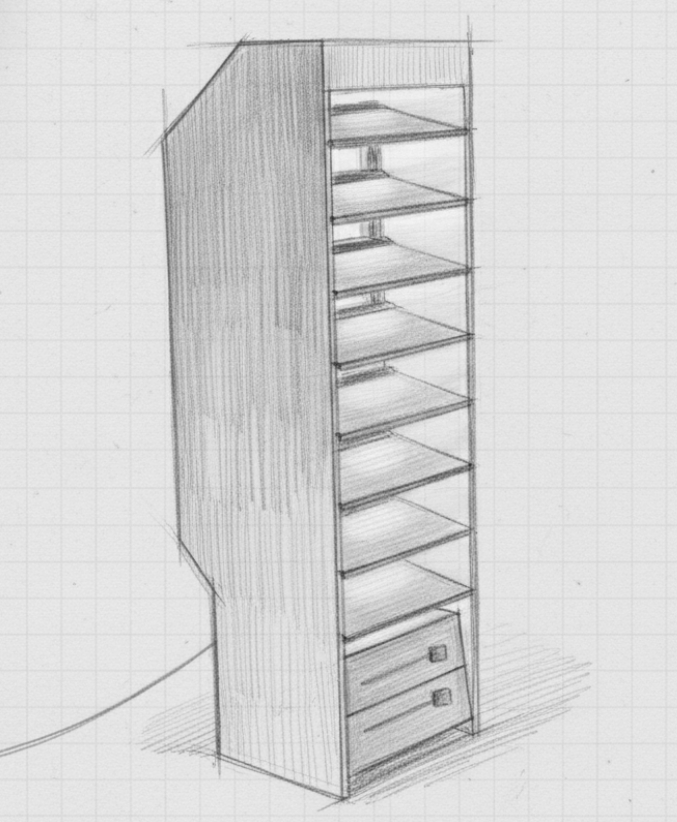 This lamp was designed as a balance between function and expression, combining precise electronic control with tactile, mechanical movement. Adjustable shades move up and down to modulate brightness and diffusion, encouraging direct interaction with the light rather than passive adjustment. The contrast between industrial materials and warm wood creates a piece that feels both engineered and refined. Designed to be timeless, the lamp functions as both a practical lighting system and an expressive object within a space.